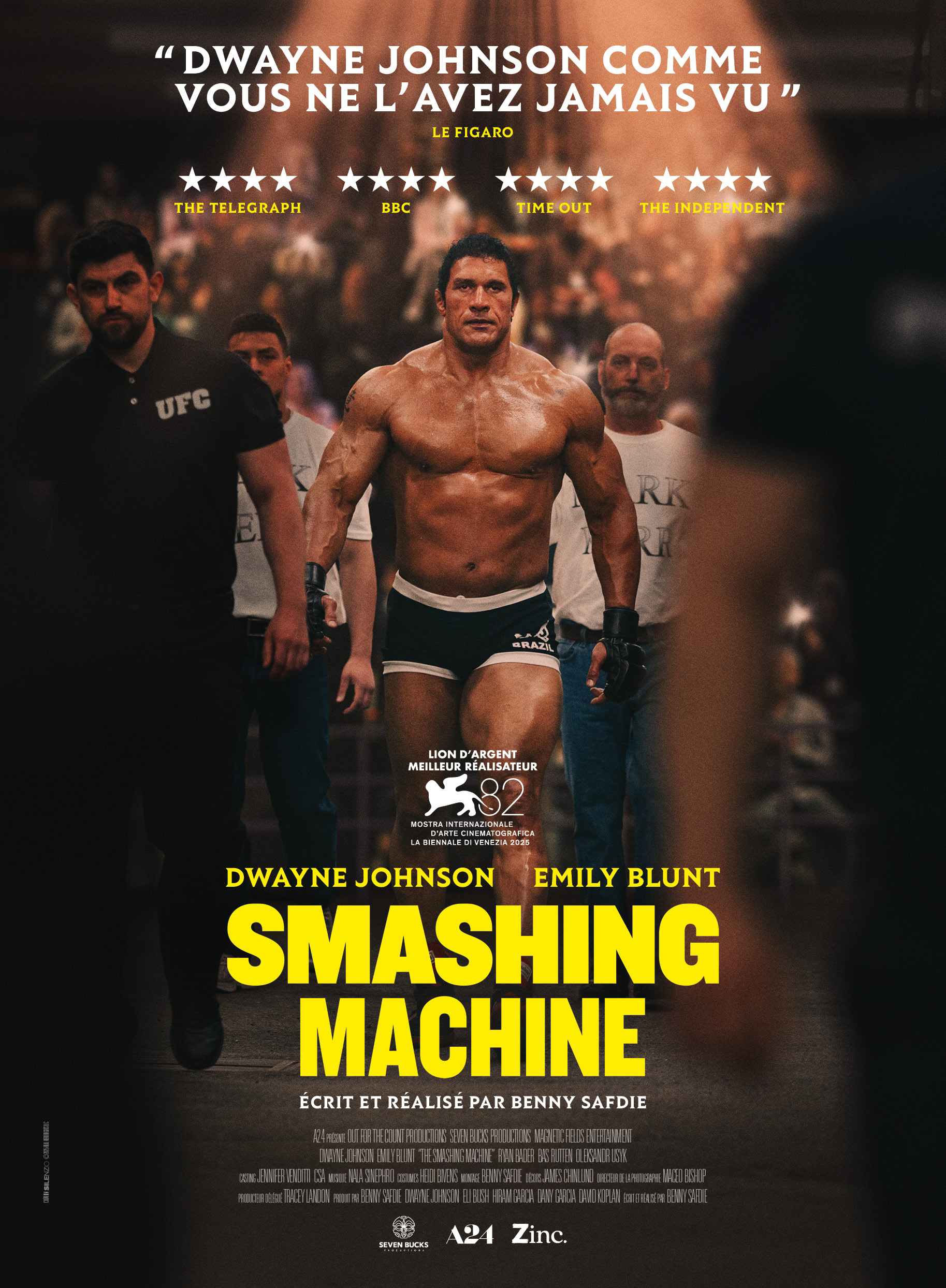 Dwayne Johnson est Mark Kerr, légende du MMA des années 90, surnommé « The Smashing Machine » tandis qu’Emily Blunt incarne son épouse, Dawn Staples.